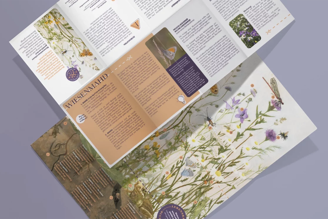 Blumenwiesen sind ein Paradies für viele Insekten und Kleintiere, die dort Nahrung, Schutz und Fortpflanzungsmöglichkeiten finden. Für Tiere wie Vögel, Frösche oder Igel sind diese Insekten wiederum eine wichtige Futterquelle. Dafür gilt jedoch: Blumenwiesen müssen gemäht werden! Wer allerdings tief und oft schneidet, vernichtet jegliches Leben in der Wiese. Als Herzensprojekt für den Naturschutz entstand daher diese Wiesenillustration mit Infofolder zum Thema Wiesenmahd. Meine Projektpartnerin, die Naturschutzexpertin Eva Kettl und ich freuen uns, dass der Deutsche Wetterdienst eine Infotafel mit der Illustration bundesweit plant!